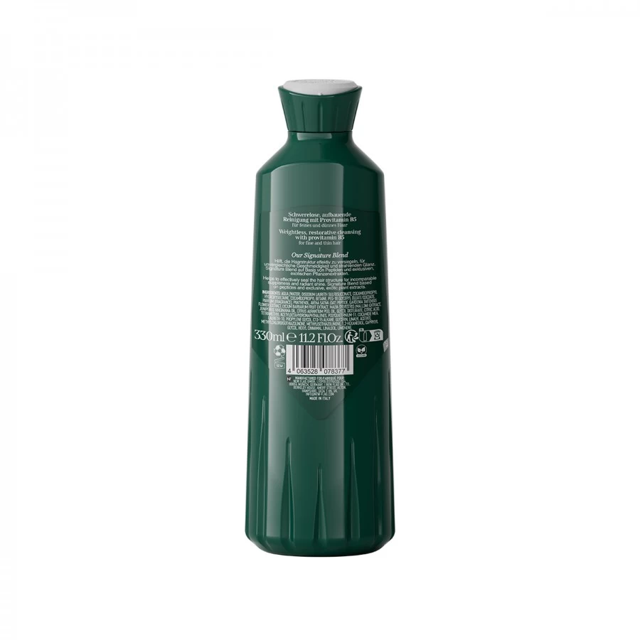 Его восстанавливающая формула с провитамином B5 укрепляет структуру волос и делает их более объемными. В составе содержатся пептиды и экстракты водорослей, которые обеспечивают глубокое увлажнение и запечатывают кутикулу, предотвращая потерю влаги. Шампунь бережно и тщательно очищает волосы и кожу головы, идеально подходит для тонких и негустых волос.